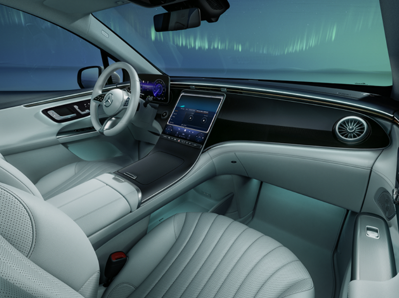 대형 전기 플랫폼을 기반으로 한 덕분에 인테리어는 디지털화된 요소와 동급 최고 수준의 여유로운 공간을 자랑한다. EQE 세단과 동일하게 12.3인치 운전석 계기판과 12.8인치 OLED 중앙 디스플레이를 탑재해 최상의 시인성을 제공하며, 제로-레이어(zero-layer) 인터페이스를 적용해 환경 변화와 사용자 행동에 의해 지속적으로 최적화되어 탑승객을 위한 세심한 어시스턴트가 되어 준다.