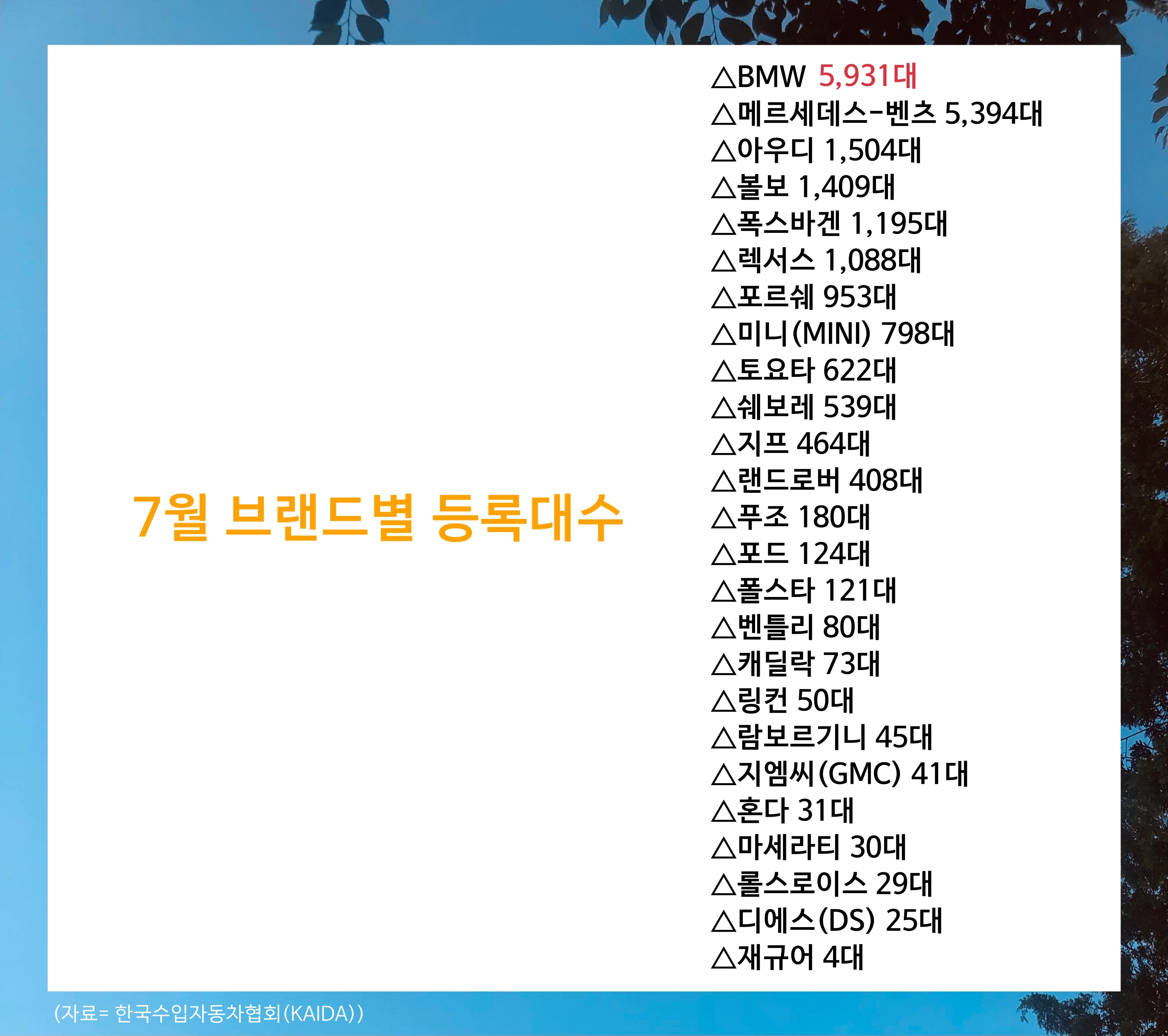 7월 브랜드별 등록대수는 △BMW 5,931대 △메르세데스-벤츠 5,394대 △아우디 1,504대 △볼보 1,409대 △폭스바겐 1,195대 △렉서스 1,088대 △포르쉐 953대 △미니(MINI) 798대 △토요타 622대 △쉐보레 539대 △지프 464대 △랜드로버 408대 △푸조 180대 △포드 124대 △폴스타 121대 △벤틀리 80대 △캐딜락 73대 △링컨 50대 △람보르기니 45대 △지엠씨(GMC) 41대 △혼다 31대 △마세라티 30대 △롤스로이스 29대 △디에스(DS) 25대 △재규어 4대였다.
