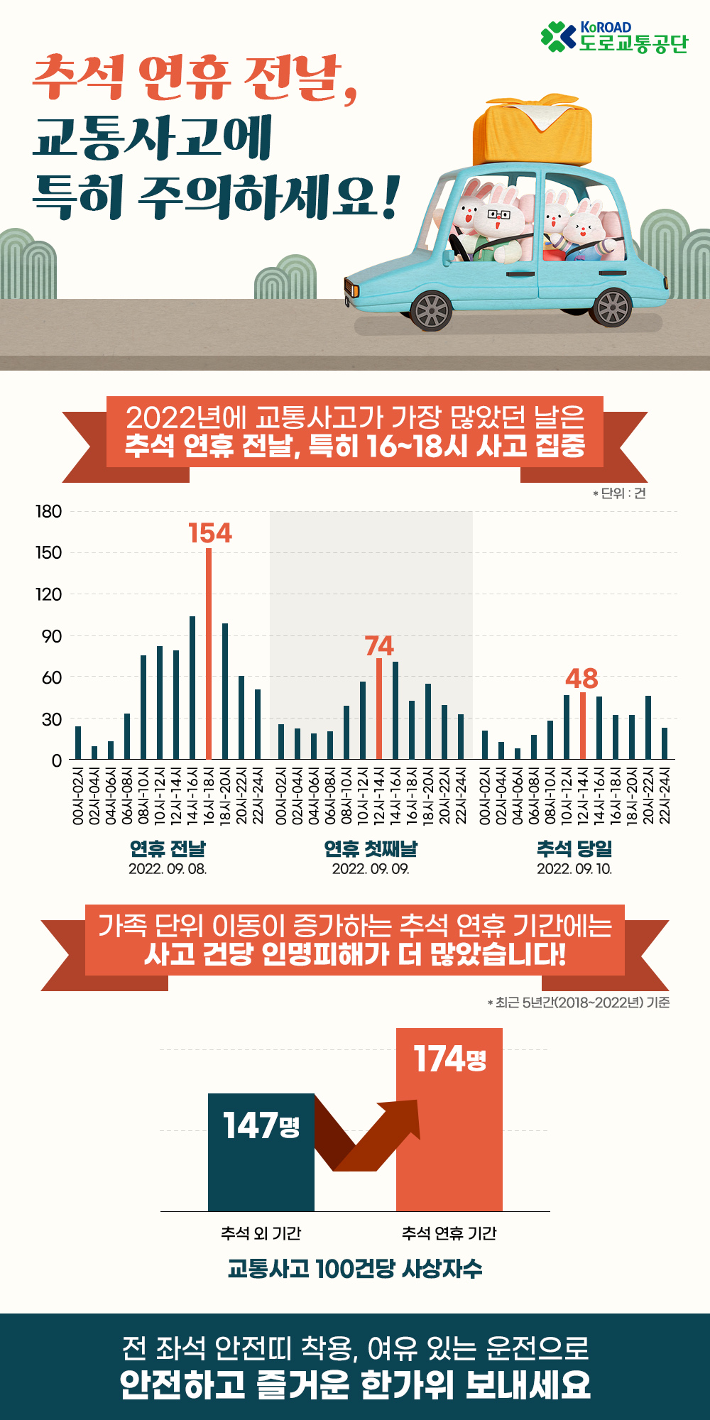 * 음주사고(추석 외 7.8%, 추석 연휴 10.7%), 고속도로사고(추석 외 2.1%, 추석 연휴 3.0%)