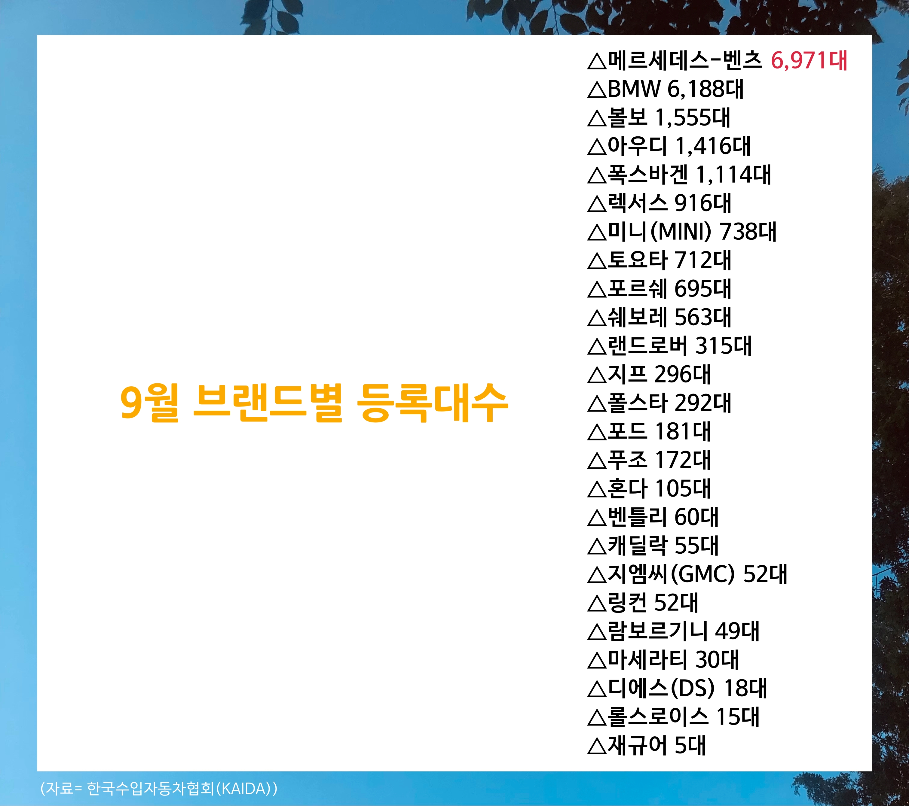 9월 브랜드별 등록대수는 △메르세데스-벤츠 6,971대 △BMW 6,188대 △볼보 1,555대 △아우디 1,416대 △폭스바겐 1,114대 △렉서스 916대 △미니(MINI) 738대 △토요타 712대 △포르쉐 695대 △쉐보레 563대 △랜드로버 315대 △지프 296대 △폴스타 292대 △포드 181대 △푸조 172대 △혼다 105대 △벤틀리 60대 △캐딜락 55대 △지엠씨(GMC) 52대 △링컨 52대 △람보르기니 49대 △마세라티 30대 △디에스(DS) 18대 △롤스로이스 15대 △재규어 5대였다.
