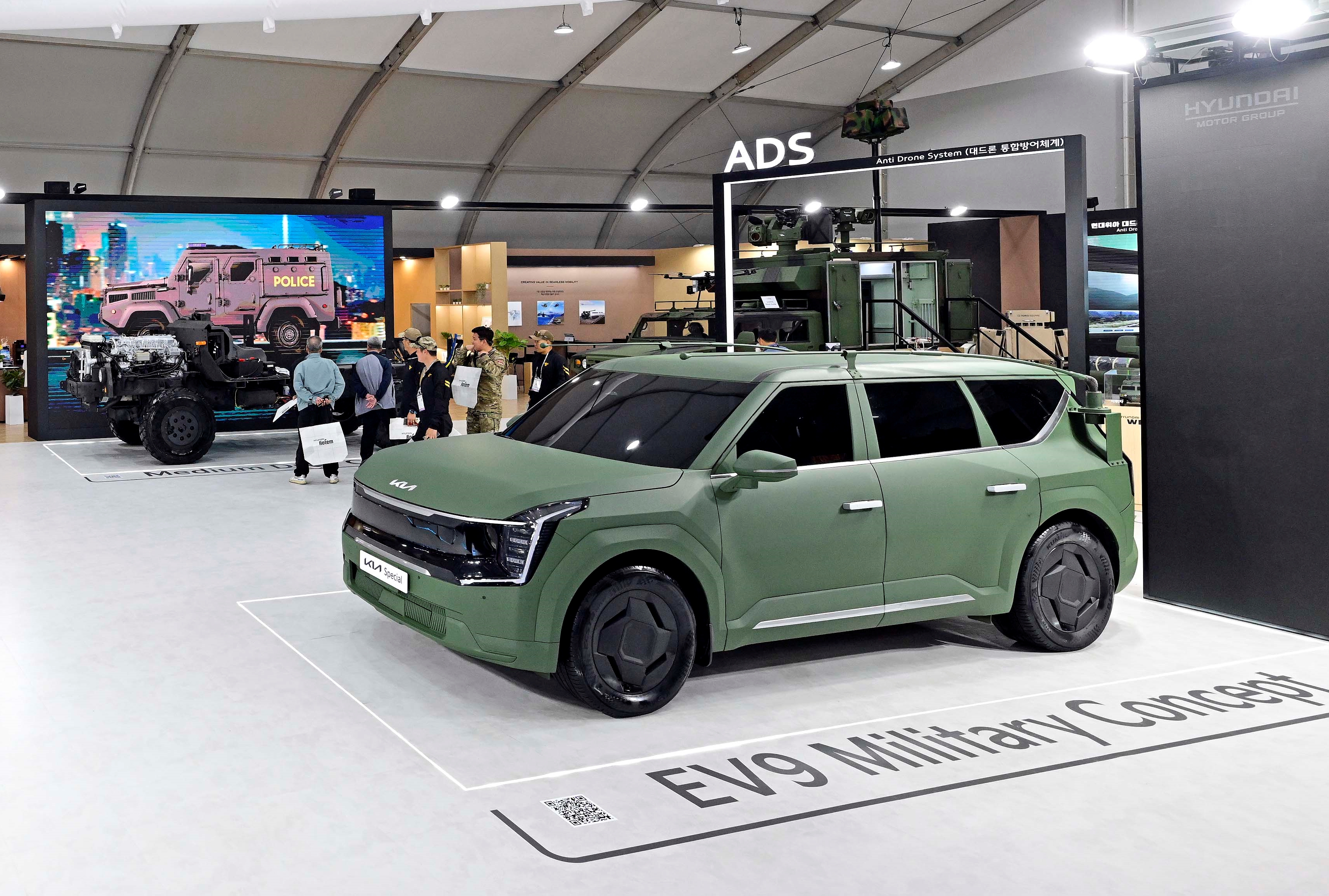 `EV9 밀리터리 콘셉트카`는 기아 플래그십 전동화 SUV EV9을 군 수송 용도에 맞게 재해석하여 선보이는 차량이며, 높은 충돌 안정성을 갖춘 차체를 바탕으로 전장 상황 속에서도 원활한 전력 공급을 가능하게 하는 V2L 기능 등을 탑재하고 있다.