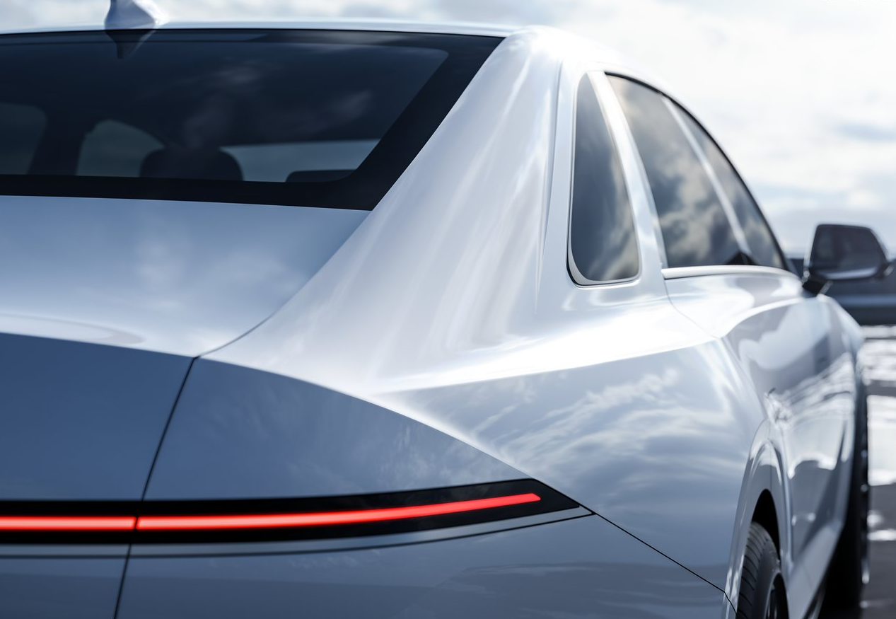 또한 측면부에서는 프레임리스 도어와 오토 플러스 도어 핸들과 함께, 헤드램프에서 리어 램프까지 매끈하게 수평적으로 이어지는 하나의 선으로 단정하면서도 와이드한 볼륨감으로 대형 세단의 지위를 공고히 해준다. 후면부는 전면부와 마찬가지로 수평하게 이어지는 리어 램프를 적용해 미래적인 디자인 통일감을 이어가는 모습이다.