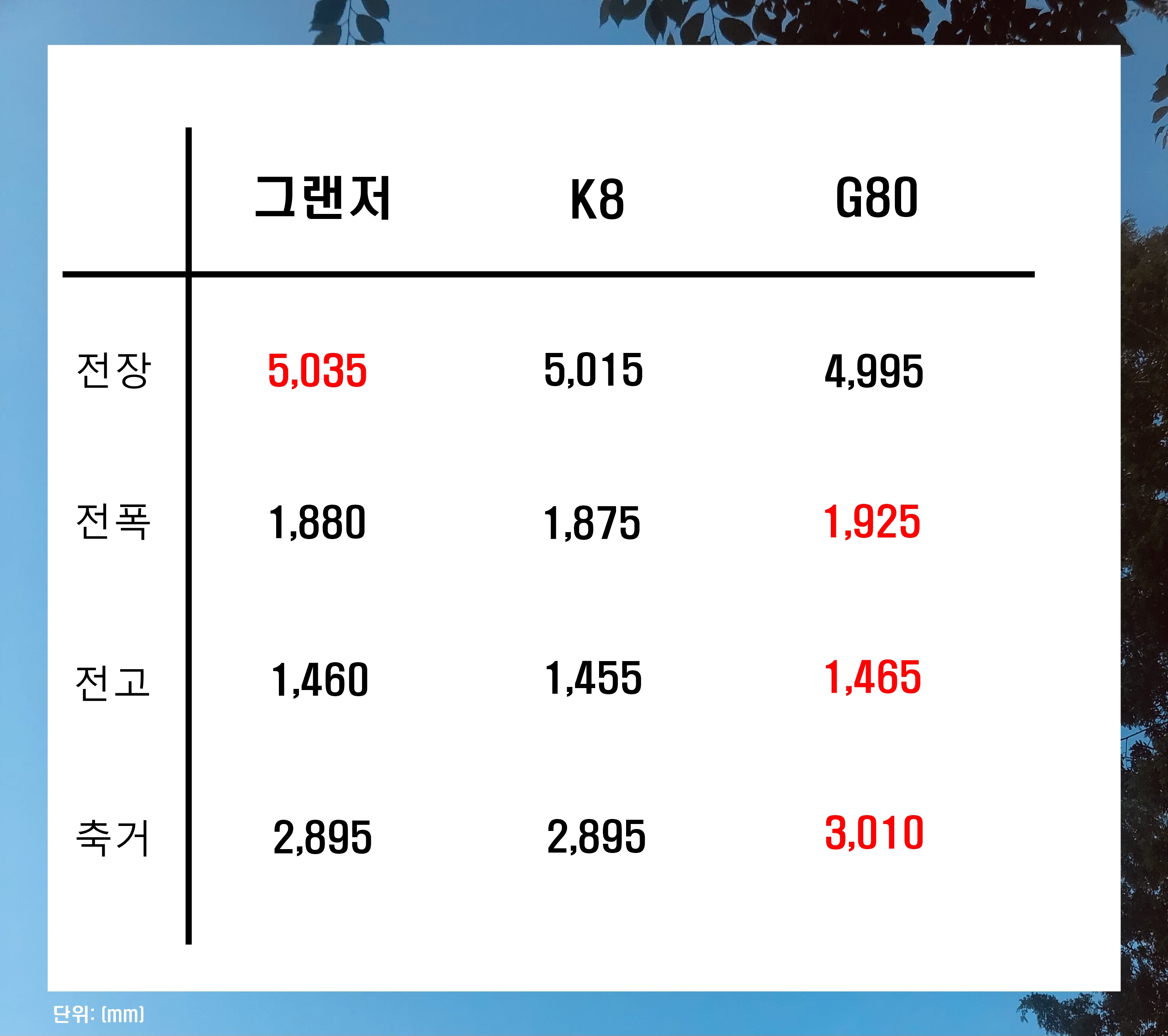 기아 `K8` 및 제네시스 `G80`과 제원을 비교하면, 전체길이는 K8과 G80보다 상대적으로 길다. 휠 베이스(축거)의 경우는 2,895mm으로 K8과 비교해 수치상 같으며, G80의 3,010mm보다는 115mm 짧다. 전반적으로 웅장한 존재감과 디테일하게 볼륨감이 강조된 디자인을 바탕으로 그랜저만의 헤리티지를 강조하면서도 미래지향적이고 중후한 감각을 드러낼 것으로 보인다.