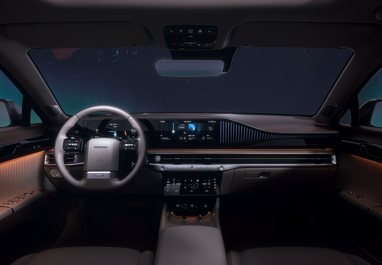 또한 크래시패드 가니시부에 적용된 `인터랙티브 앰비언트 무드램프`는 드라이브모드, 음성인식, 웰컴∙굿바이 시퀀스 등 각 시나리오 별로 다양한 색을 발산해 마치 탑승객과 차가 항상 연결되어 있는 느낌을 더해주고 한층 여유로운 주행 경험을 제공한다.