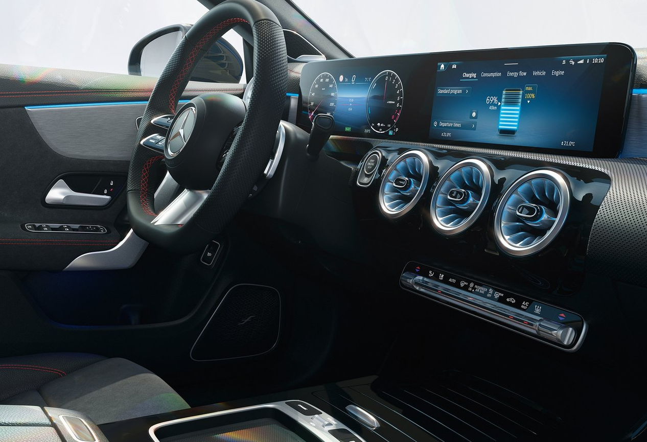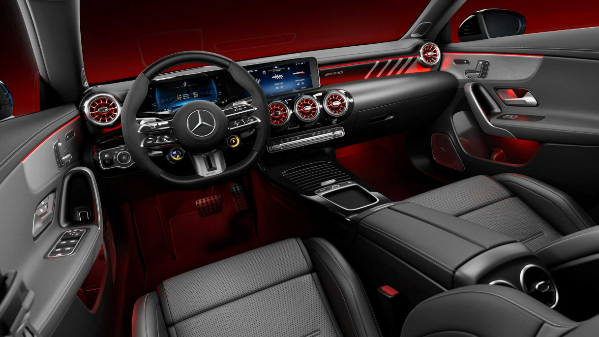 실내 공간은 지난 2022년, 벤츠 A클래스 해치백이 선보였던 인테리어 업그레이드를 공유하는 분위기로, 10.25인치 계기판 및 터치스크린의 독립형 듀얼 디스플레이를 통해 인포테인먼트 시스템을 제공한다. (7인치와 10.25인치 디스플레이 표준)